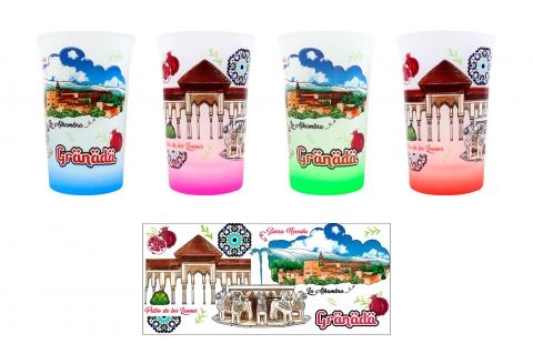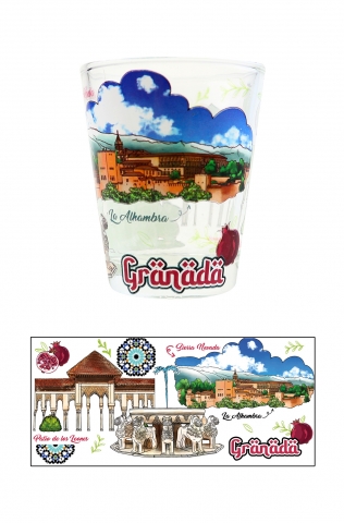 Chupito cristal transparente con policromia y motivos de Granada. Tamaño 6 x 5 cm.