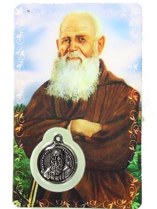 Estampa plastificada con medalla en metal incrustada y oración en el reverso. Medidas 8.7 cm x5.4 cm. Fray Leopoldo de Alpandeire.