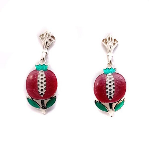 Pendiente Granada de gancho hippie en Plata de Ley con esmalte rojo. Medidas (Largo x Ancho) 0.6 x 1 cm.