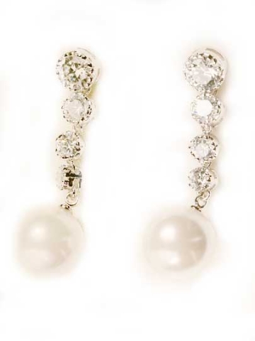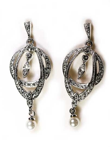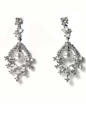 Rhodium metal earrings with crystal and pearl designed by Cano. Measures 36x16 mm.
