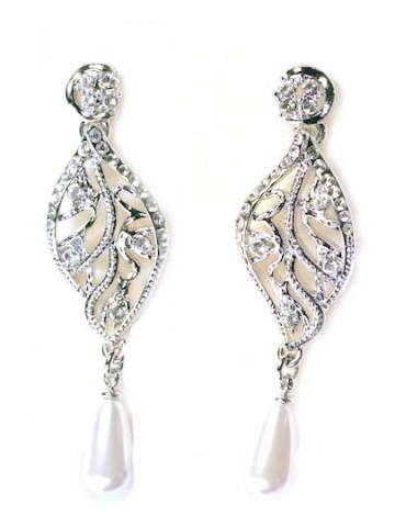 Rhodium metal earrings with crystal and pearl designed by Cano. Measures 42x14 mm.