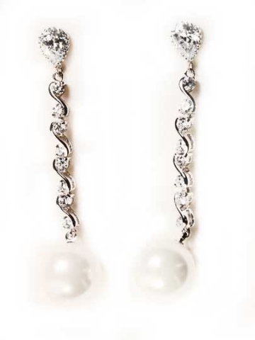 Rhodium metal earrings with crystal and pearl designed by Cano. Measures 55x16 mm.