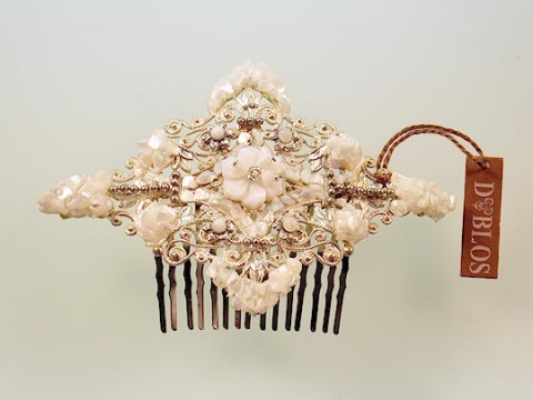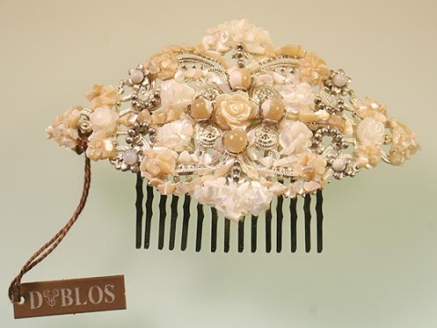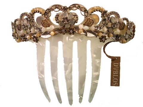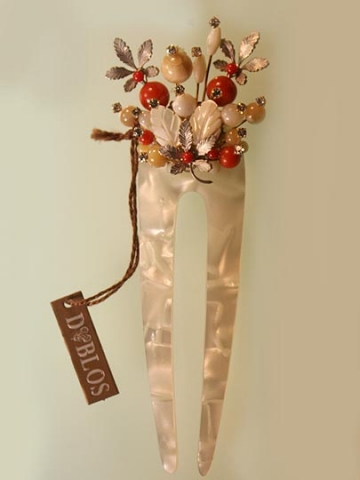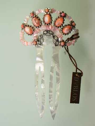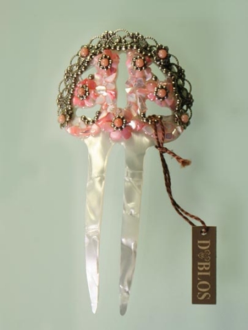 Horquilla bolas y pipas de nácar,coral y strass con plata. Diseño de Dublos.
