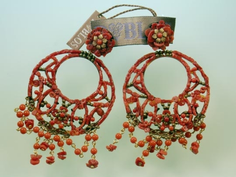 Coral earrings with cameos finished in copper with gold flowers. Design Dublos.