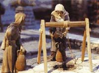 En aquellos tiempos, el trabajo del ama de casa comenzaba con la salida del sol. Desayunaban un poco de pan y requesón. Después acudían, portando un cántaro de barro, al pozo o fuente comunal, donde se encontraban con las demás mujeres y sus hijos (Ref 1038). Después de llenar el cántaro de agua fresca, regresaban a casa.