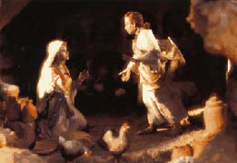 Los pastores (Ref 1308) (Ref 1307) (Ref 0118-0) eran gentes socialmente mal considerada. Se les tenía por falsos, embusteros, ladrones. Sin embargo es a ellos a quienes se les aparece el Ángel de Dios, para anunciarles el nacimiento de su Hijo. Los pastores fueron los primeros que recibieron la Buena Nueva. El momento de ese anunciamiento es justamente el que podemos contemplar en esta escena.