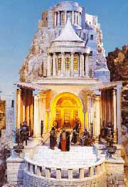 Jerusalén tal como suponemos que la conoció Jesús. Está rodeada de almenas y murallas y a través de sus puertas abiertas, vemos las calles estrechas, los arcos, las caravanas de camellos y, sobre todo, el edificio conocido como Segundo Templo, construído por Herodes el Grande, y que tenía diversos atríos que lo circundaban. Se accedía a él subiendo quince escalones y atravesando la gran puerta de bronce, conocida como la puerta de Nicanor, que había sido traída desde Antioquía.